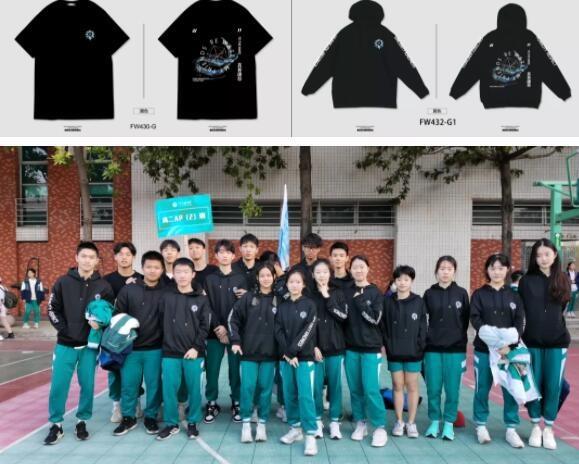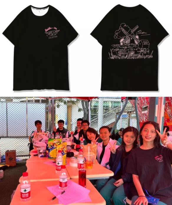 我们的班服样式为短袖,考虑了广州的天气,一件短袖的班服可以让班级成员们一年四季都穿得上,增加了实用性。同时我们还设计了两种颜色,不止于酷炫的黑色,还有象征青春活力的粉色。班服的图案由我们班同学亲手创作,吊床的元素象征着我们班一直以来的“佛系”理念。即:友谊比赛第二。