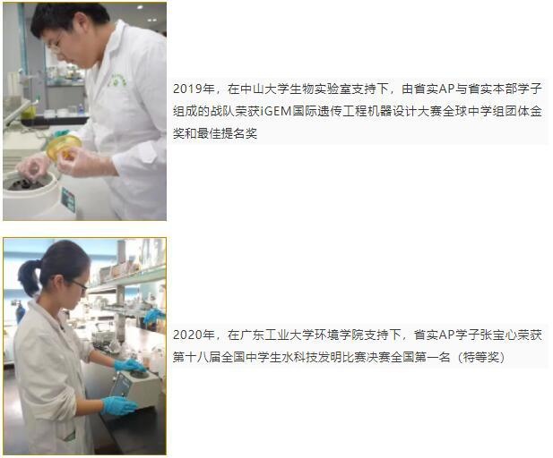 以科研为引领 我们还与中山大学、华南理工大学、华南农业大学等著名院校建立合作,让学生深入大学教授前沿实验室,在研究项目参与中充分发掘其科研探究创新能力。近几年,在著名院校的支持下,省实AP学子在科研项目上屡获佳绩: