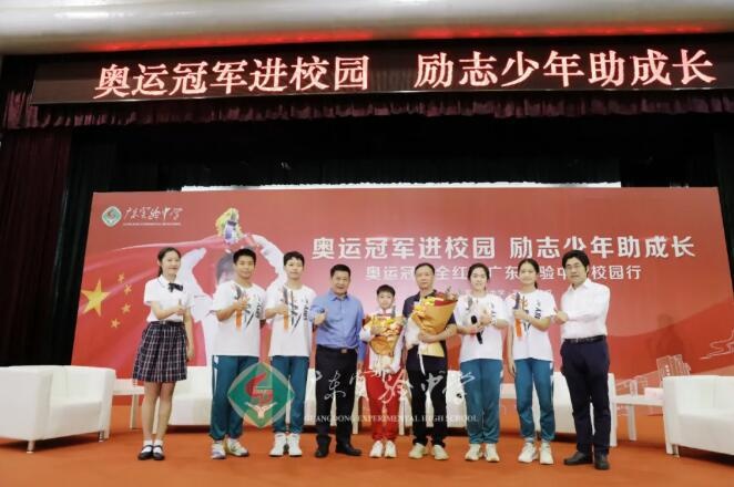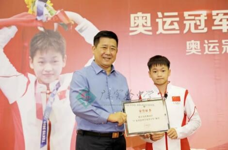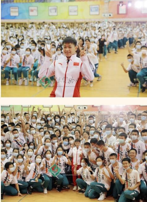 全汉炎校长为全红婵颁发了“荣誉学生”证书。全校长说,从奥运冠军全红婵身上我们看到一种积极、阳光、向上的精神,她的成功是她拼搏奋斗的结果。全校长希望每位同学能够发现自己的天赋,超越自我,成为最优秀的自己!鼓励同学们以奥运冠军全红婵为榜样,以家国天下为己任,树立远大志向,锤炼踏实作风,磨砺坚毅品格,实现全面而有个性地发展,创造属于自己也属于这个伟大国家和伟大时代的辉煌!