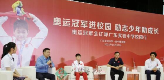 10月15日上午,奥运跳水冠军全红婵和教练何威仪来到广东实验中学高中校区体育馆,与同学们现场互动,并在广东实验中学“世界冠军林”参加植树活动。