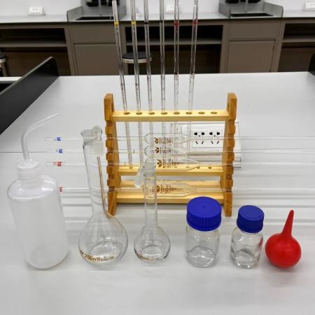 使用精细滴定管,指示剂辅助,磁力搅拌装置混匀,带领学生学习滴定实验的操作流程,润洗操作,读数方式,以及正确的滴定管操作手势和判断滴定终点的颜色变化等。