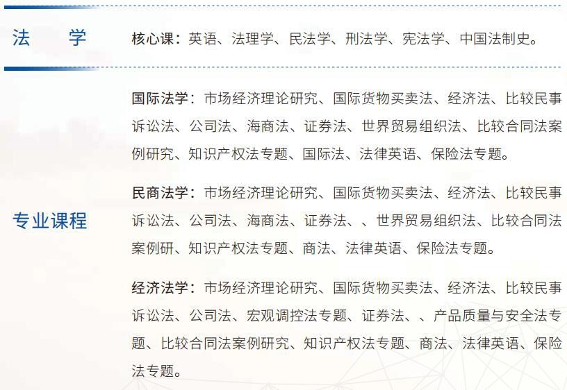 对外经济贸易大学法学院目前为学科体系设置相对完整、国际法专业特色鲜明、学术和教学水平比肩的知名法学院。法学院设有完整的本科、硕士、博士人才培养体系,1985年即成为全国首批获得国际经济法专业博士学位授予 权的四所院校之一。