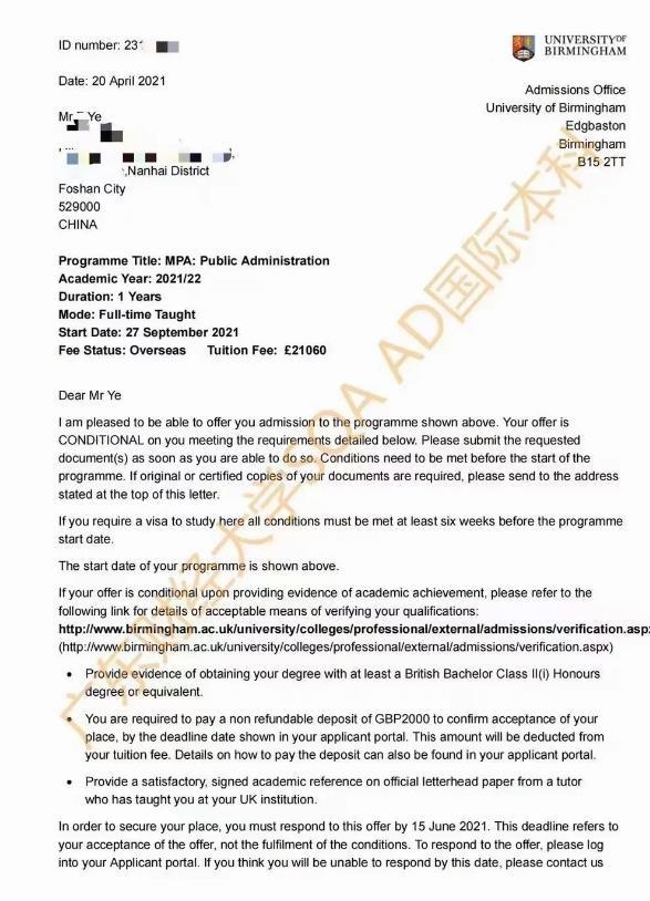 叶*宏 英国伯明翰大学(QS87) 公共管理专业