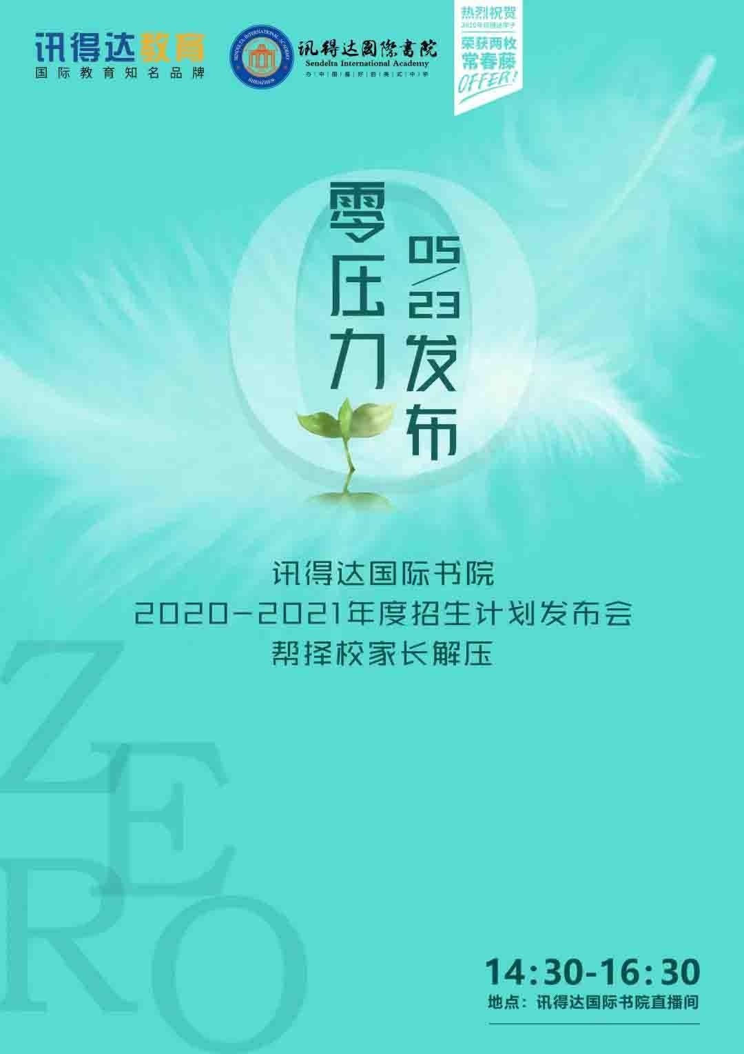 5月23日,讯得达国际书院2020-2021年度“零压力”招生计划发布会重磅宣布,帮您解压。家长们可通过文章底部看校表单进行报名!