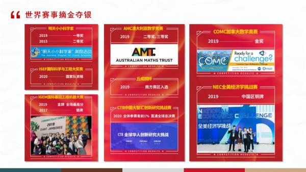 AMC澳大利亚数学竞赛、COMC加拿大数学奥赛、ISEF国际科学与工程大奖赛、丘成桐杯、NEC全美经济学挑战赛、iGEM国际基因工程机器大赛……在各种各样的世界赛事中,讯得达学子摘金夺银,但绝不止步于此。办学近十年,826名优秀毕业生从这里走向世界名校,又从名校走向世界名企或者升读名校深造。