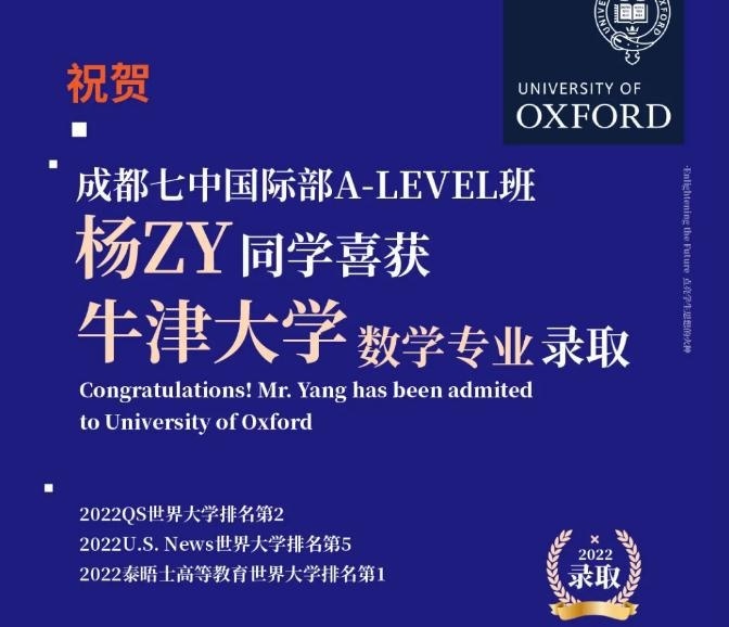 成都地区所英国G5名校录取大满贯学校来了——成都七中国际部,就在2022年1月11日牛津大学正式放榜,成都七中国际部收获两枚来自牛津大学的录取通知书。