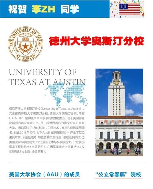 德州大学奥斯汀分校是德州大学系统的旗舰级大学,也是美国的公立大学之一;该校在新闻传播、商科、理工科方向都实力雄厚,是一所文理兼备的综合性大学;因州政府的法律规定,其本州学生的比例常年居于90%以上,所以国际学生的申请竞争非常激烈,学校内国际生占比仅2.4%。李同学录取的航空工程专业(Aerospace Engineering)是该校的王牌专业之一(全美专业排名为Top7),这让痴迷航空航天工程专业的李同学激动不已,期待他在自己热爱的领域不断前进。