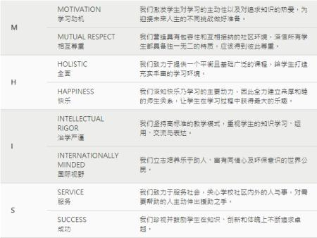 教导学生如何在不同领域及范畴上坚持不懈地追求卓越;让他们掌握必备技能,发展成一个具备批判性思维,能充分实现自我的问题解决者及富有同情心的世界公民。