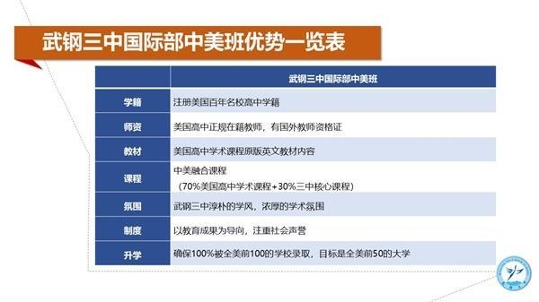 武钢三中国际部详细介绍武钢三中国际部与美国康州百年高中联合开设的中美班,是武钢三中对外教育合作开放交流的重要项目之一。该项目引入美国教学理念,同时融入中国教育部规定的达到高中毕业水平的核心课程。项目学制3年,采用国家课程与国际课程相结合的模式,小班教学,以学生为中心,互动式的教学,美方课程全部采用原版美国教材内容,以先进开放地教育方式及理念,通过美国教师督导教学提供完整的美国高中学习体验。学生入学即进入美国高中学籍管理系统,学生毕业时通过美方考评可获得全世界公认的美国高中并以美国高中毕业生身份申请进入美国!我们课程的核心价值“知识、创新和全球意识”始终贯穿于整个教育方案。