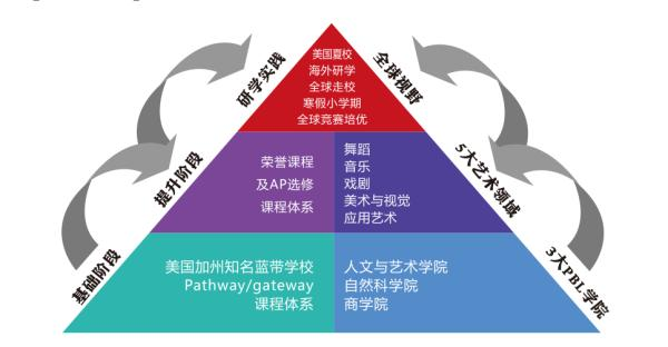采用美国加州A-G的课程体系标准,课程体系和难度直接对接大学,由A-G课程体系+生涯规划+留学申请服务所组成的综合美式教育闭环体系,将知识-技能-思维-元认知-情绪管理等核心要素打通。